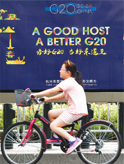 8月27日,在杭州市西湖南山路,一个小朋友骑车从G20宣传画前经过。