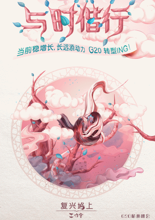 第一幅,“与时偕行”。作为2016年G20杭州峰会主席国,中国将积极推动G20“破茧新生”,从短期的危机应对平台向长期治理平台转型,实现转型和发展。