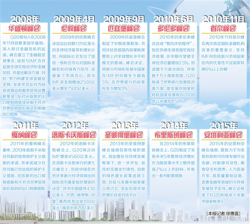 从华盛顿到首尔,从洛斯卡沃斯到安塔利亚,G20领导人峰会迄今已举行过10次。历次峰会围绕现实问题设置议程,推动了全球主要经济体就促进国际金融稳定和经济持续发展合作,为世界经济增长、国际经济合作不断凝聚共识,并达成累累硕果。这使得G20逐渐演变成为当今全球经济治理的首要平台,逐步从危机应对向长效治理机制转型。随着杭州峰会的举办,G20将创新机制建设,打造合作平台,让人们对世界经济重焕生机充满期待。(来源:经济日报 记者:徐惠喜)