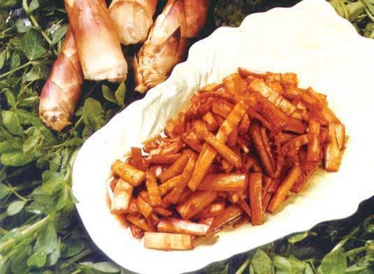 杭州《四时习俗》一书中记载说:“普通菜蔬均喜用笋。春夏之交食春笋,夏秋食边笋……十月以后食冬笋,各种荤菜亦加笋为配料,可谓无日不笋,无食不笋。”“油焖春笋”选用杭州近郊清明节前出土的嫩笋,以重油、重糖烹制,色泽红亮,鲜嫩爽口,略带甜味,百吃不厌,是颇受广大食者欢迎的一道传统风味菜。这道菜1956 年被浙江省认定为36 道杭州名菜之一。