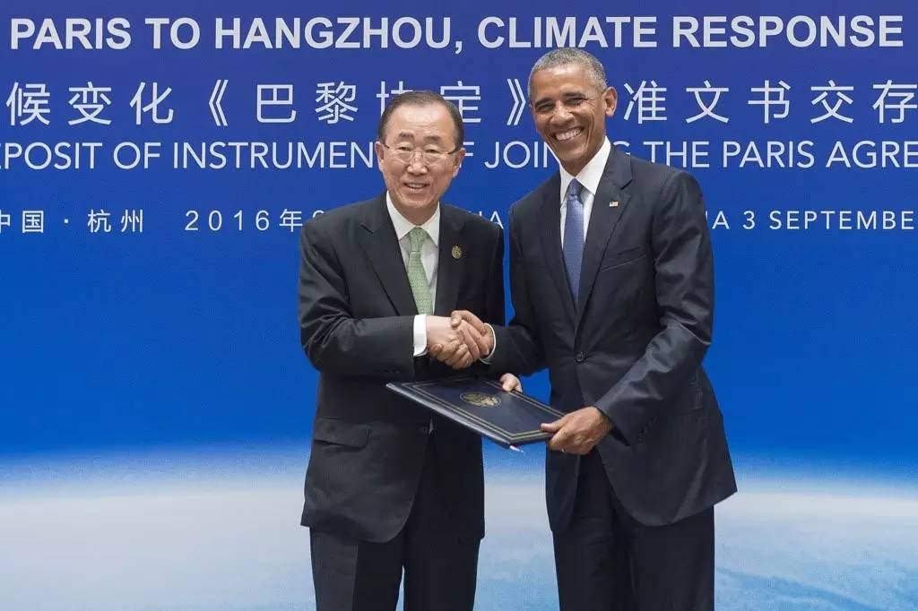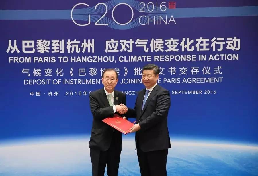 9月3日下午,国家主席习近平同美国总统奥巴马、联合国秘书长潘基文在杭州共同出席气候变化《巴黎协定》批准文书交存仪式。习近平向潘基文交存中国气候变化《巴黎协定》批准文书。