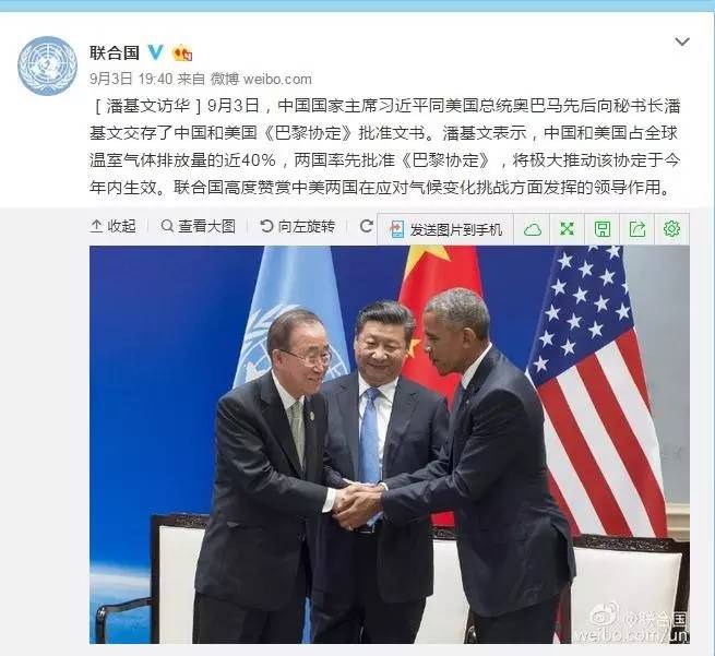 《巴黎协定》批准文书交存仪式后,@联合国 官方微博也特意发了两条微博,为中美两国的表率之举点赞!