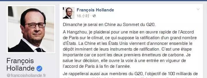 法国总统奥朗德在Facebook上发布信息称,对中美两国的决定表示欢迎。他认为,中美双双批准《巴黎协定》是“具有重要意义的一步”,为促进该协定在年底生效拓宽了道路。