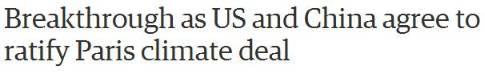 英国卫报用了“突破性进展”的标题来描述中美加入巴黎协定。