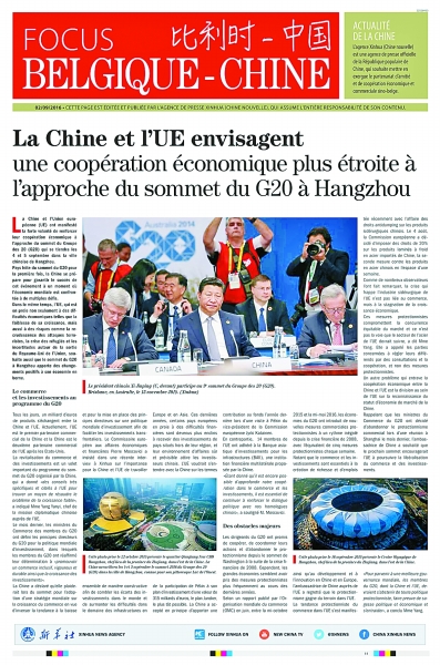 本报布鲁塞尔9月4日电(记者刘军)比利时法语区主流媒体《晚报》日前刊登了G20杭州峰会专版,题为“中欧将在G20杭州峰会加强经济合作”。专版刊登了习近平主席2014年出席澳大利亚布里斯班G20峰会和杭州G20峰会会场的大幅照片(上图),刊发了对中国驻欧盟大使杨燕怡、欧盟委员会经济事务委员莫斯科维奇以及一些专家、学者和智库人士的采访。专版文章说,中国和欧盟均表达了在杭州峰会期间加强经济合作的强烈愿望。中国在世界经济遇到诸多困难时召开G20峰会,是对国际责任的担当,相信中国会尽一切努力确保峰会取得圆满成功,为世界经济复苏注入新的活力。