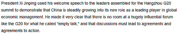 习近平主席在二十国集团(G20)杭州峰会上发表的欢迎辞充分说明中国正在稳步强化新角色,在全球经济治理中发挥领导作用。他明确指出,像G20这样影响力巨大的组织绝不能成为“清淡馆”,磋商必须落实为共识,共识必须落实为行动。