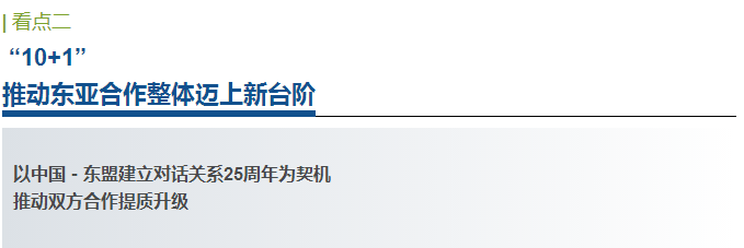 东盟是东亚合作的中心和中国周边外交的优先方向。中国-东盟建立对话关系25年来,双方政治互信不断加深,务实合作成果丰硕。李克强总理将在10+1领导人会议暨中国-东盟建立对话关系25周年纪念峰会上全面回顾双方关系发展成就,总结有益经验,继续推动落实“2+7合作框架”,倡议在巩固和深化政治安全和经贸合作同时,以教育和旅游为优先方向,将人文交流打造为双方关系新支柱,为双方合作注入新动力。中方将重申对东盟睦邻友好合作政策,强调中方将一如既往地支持东盟共同体建设,支持东盟在区域合作中的中心地位,支持东盟在国际地区事务中发挥更大作用。