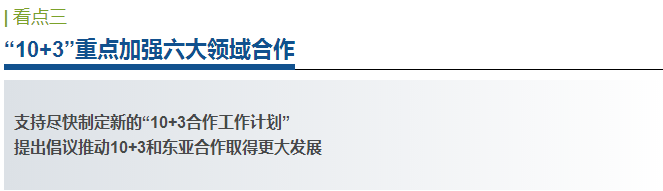 10+3合作是建设东亚经济共同体、推进东亚合作的主渠道,将于明年迎来成立20周年。今年以来,10+3合作在财政金融、粮食安全等领域取得积极成果。李克强总理将在10+3领导人会议上推动各方加大投入,进一步明确机制未来发展方向。推动共同落实好《2013-2017年10+3合作工作计划》和《第二东亚展望小组报告》,支持尽快制定新的“10+3合作工作计划”,重点加强金融安全、贸易投资、农业减贫、互联互通、产能和人文领域合作,并提出一系列倡议推动10+3和东亚合作取得更大发展,共同迈向东亚经济共同体的既定目标。