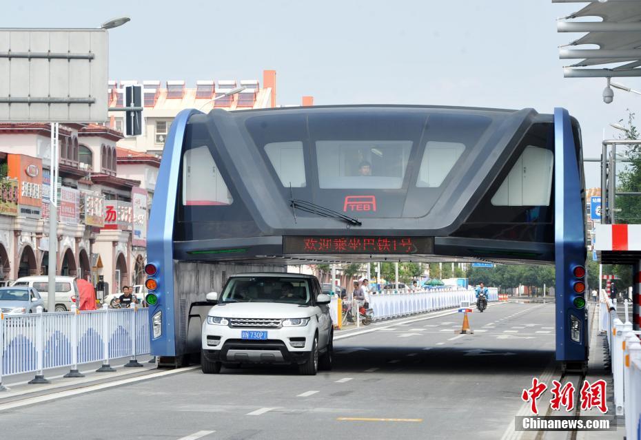 9月5日,中国自行设计研制的“空中巴士”——“巴铁1号”在河北秦皇岛综合试验以来,引发国内外广泛关注。据巴铁知识产权所有方、“巴铁科技”发言人李楠表示,现场这套测试线路至少还要续留一年以上的时间,还需要进行一些测试、展示和数据采集。计划2017年开放这条道路,让社会车辆从“巴铁”线路下方通行,普通市民可以直接参与到“巴铁”整个测试过程。图为一辆越野车从测试中的“巴铁”下方通过。 中新社记者 翟羽佳 摄