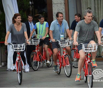 阿根廷总统马克里在岸边骑杭州公共自行车