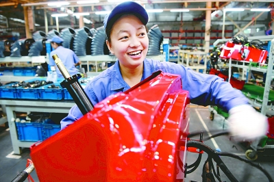 近年来,一拖集团借助“一带一路”的东风,初步完成了全球营销网络的布局,成为中国制造在国际市场上的一张名片。图为一名女工在位于河南洛阳的一拖集团第三装配厂生产东方红拖拉机。新华社记者朱祥摄