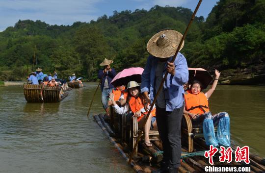 图为港澳大学生乘竹排游览九曲溪。 吕明 摄