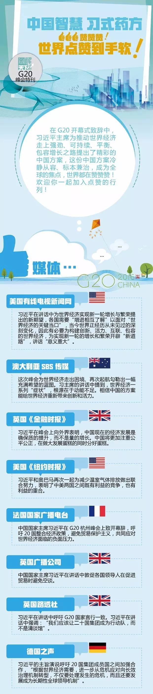 在G20开幕式致辞中,习近平主席为推动世界经济走上强劲、可持续、平衡、包容增长之路提出了精彩的中国方案,这份中国方案冷静从容、标本兼治,成为全球的焦点,世界都在赞赞赞!欢迎你一起加入点赞的行列!