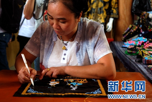 “绣娘”丁明焕接受采访时正在做刺绣,她说完成这件刺绣大概需要一个星期,能卖到600元。新华网陈俊松 摄