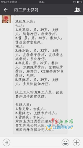 已获救人员名单:桥北边:1。吴其华,男,29岁,上饶人,胸部挫伤,肋骨骨折。2。黄 勇,男,30岁,泰和人,重症监护室抢救。