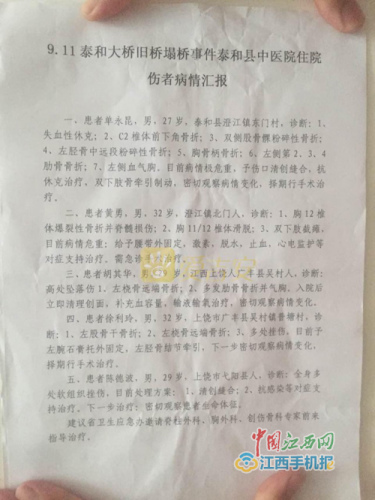 桥南边:3。徐利玲,男,32岁,上饶人,左骨骨干骨折,左桡骨远端骨折,多处挫伤。4。单永昆,男,27岁,泰和人,双侧股骨骨折,左侧胫骨骨折,肺挫伤,C2椎体前下角骨折,气胸。5。陈德波,男,29岁,上饶人,多处软组织挫伤。