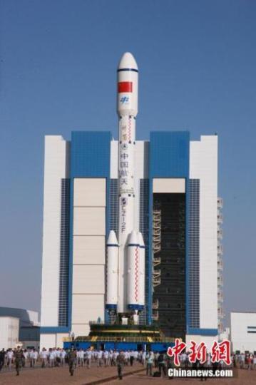 中国天宫二号空间实验室将于9月15日22时04分发射。图为天宫二号空间实验室与长征二号F T2火箭已垂直转运至发射塔架。 孙浩 摄