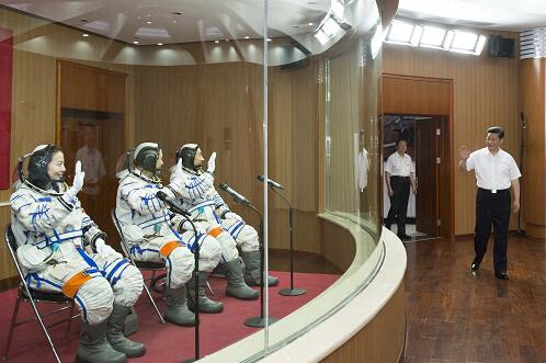 习近平来到航天员公寓问天阁,为即将出征的神舟十号航天员壮行。“你们这次执行的是我国第五次载人航天飞行任务,这承载着中华民族的航天梦。在此,我祝你们成功,期待你们凯旋。”