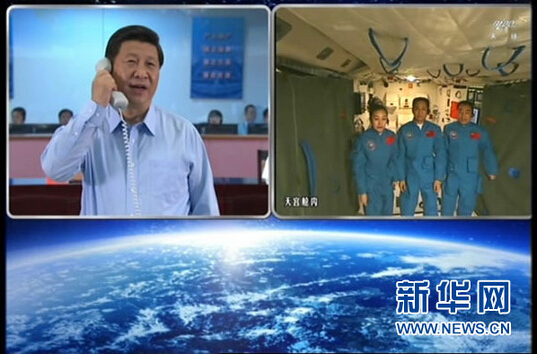 13天后,习近平总书记在北京航天飞行测控中心,与正在天宫一号执行任务的三位航天员进行天地通话。习近平表示,飞天梦是强国梦的重要组成部分,随着中国航天事业的快速发展,中国人探索太空的脚步会迈得更大、更远。