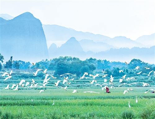 江西会昌县周田镇小田村,白鹭在田间飞舞。1934年10月红九军团1万多人在会昌集结,踏上长征路。