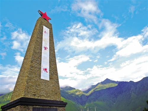 四川泸定县岚安红军烈士纪念碑在蓝天白云映衬下庄严肃穆。1935年,中国工农红军红32军和红4军长征到此。 曹正平摄