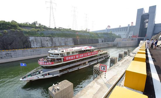 9月18日,“长江三峡9号”游轮驶离升船机进入下游引航道。新华社记者 程敏 摄
