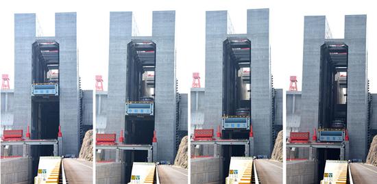 从左至右为升船机的承船厢从上降下(拼版照片)。新华社记者 程敏 摄