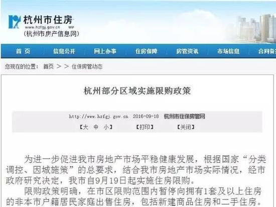 18日,杭州市住房保障和房产管理局公布了《杭州部分区域实施限购政策》,宣布自9月19日起实施住房限购。限购政策明确,在市区限购范围内暂停向拥有1套及以上住房的非本市户籍居民家庭出售住房,包括新建商品住房和二手住房。限购范围为上城区、下城区、江干区、拱墅区、西湖区、杭州高新开发区(滨江)、杭州经济技术开发区、杭州之江国家旅游度假区、萧山区、余杭区,不包含富阳区、大江东以及临安、桐庐、建德、淳安四县(市)。限购时间明确,新建商品住房以网签平台商品房买卖合同签订时间为准;二手住房以网签平台房屋转让合同签订时间为准。