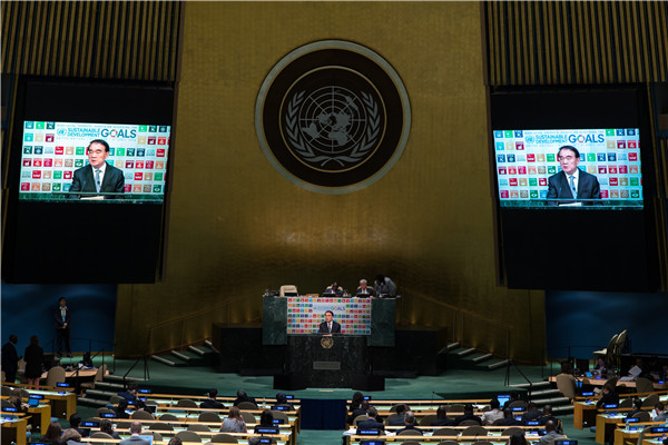 2016年4月21日,在纽约联合国总部,中国外交部副部长、中方二十国集团(G20)事务协调人李保东在联合国大会实现可持续发展目标高级别主题辩论上发言。(新华社记者 李木子 摄)