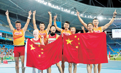 9月14日,里约残奥会田径女子4×100米T11—13级决赛,中国运动员夺得金牌后与领跑员一起庆祝。