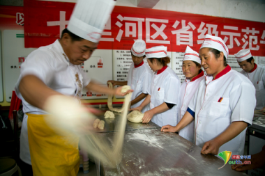 拉面师傅周兴国向精准扶贫建档立卡户讲授牛肉拉面制作技巧。中国青年网记者 孙钊 摄