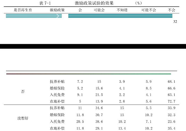 值得注意的是,在四个方面政策激励效果的横向比较中,“入托或入幼儿园免费”的政策激励效果最为明显,且明显高于其他政策试验的激励效果。这或许能反映“入学难”的普遍现实。
