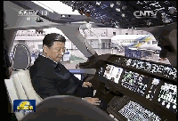 2014年5月23日,习近平在上海考察期间,在中国商飞设计研发中心C919大型客机展示样机驾驶室察看,了解速度表、高度表、航迹图等有关仪器仪表情况。