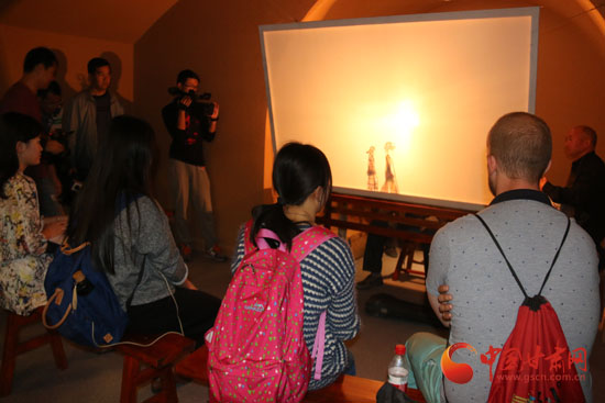 采访团正在观看皮影表演