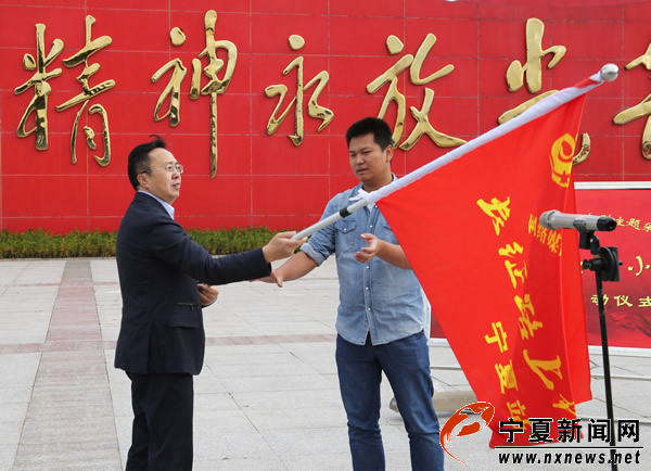 自治区党委宣传部副部长、网信办主任徐贺向采访团授旗。