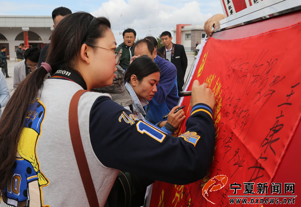 采访团记者在“走转改”红旗上签下自己的姓名。