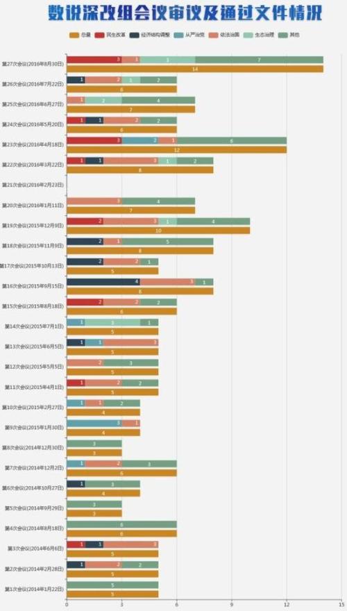 32个月,27次会议,接近“每月一次”的召开频率渐成“惯例”。27次会议审议及通过的文件情况如何?每次会议都谈及了哪些重点改革领域?