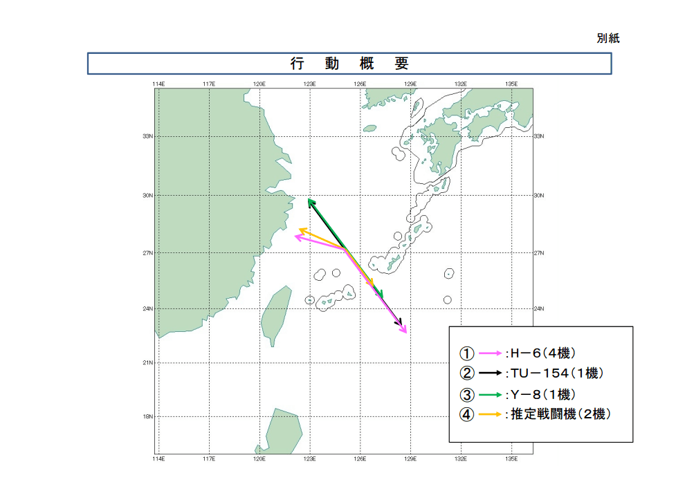 根据日本防卫省统合幕僚监部9月25日当天发布的公告显示,25日当天共有8架中国军机出现在东海空域。8架军机分别为4架H-6战略轰炸机、1架TU-154电子侦察机、1架Y-8侦察机。另外2架军机据推断可能是中国空军战机。