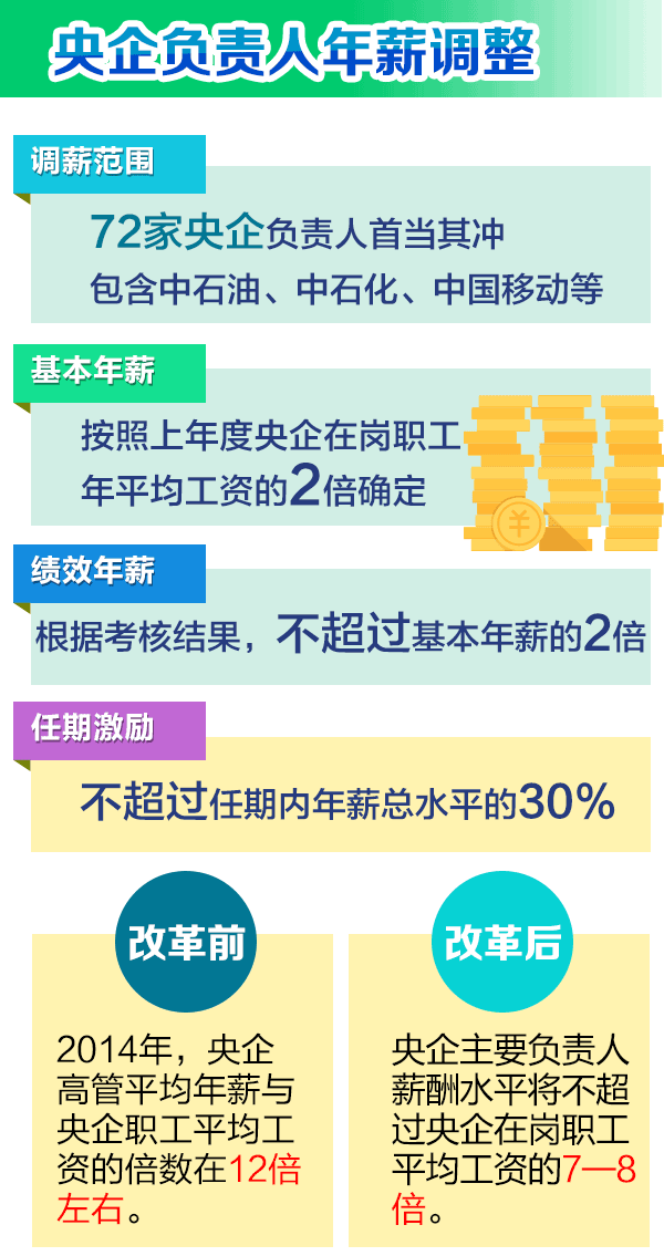 改革后,据人社部透露,从2015年1月开始,央企已全部按要求调整了企业负责人的基本年薪标准。多数中央管理企业负责人的薪酬水平下降,有的下降幅度还比较大。