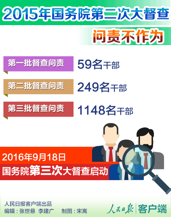 2015年,国务院第二次大督查首次对行政不作为进行了问责,7个省的59名干部受到处分。之后,在跟踪审计和专项督查的基础上,还连续开展了两批督查问责,相继有1397名干部因庸政懒政怠政和不作为被相关地方严肃问责。今年9月18日,国务院启动第三次大督查,20个督查组分赴各地各部门,“为官不为”再次成为督查的重点。(完)