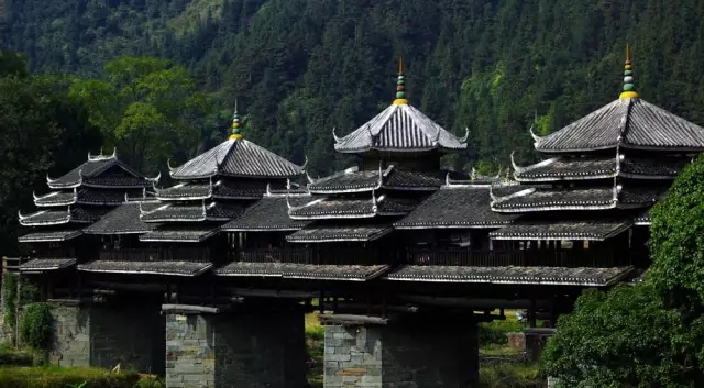 △ 风雨桥是侗族的特色建筑。图中的风雨桥位于侗族最大的聚集区——贵州省,长度超过50米,修建于1894年。风雨桥方便行人过往歇脚,也是迎宾场所。通常由桥、塔、亭组成。用木料筑成,靠凿榫衔接,风格独特,建筑技巧高超。桥面铺板,两旁设置栏、长凳,形成长廊式走道。石桥墩上建塔、亭,有多层,每层檐角翘起,绘凤雕龙。顶有宝葫芦、千年鹤等吉祥物。