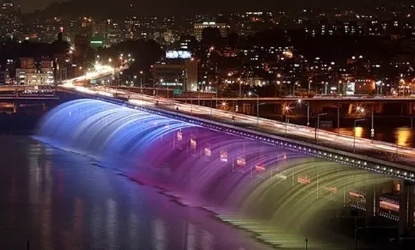 △ 2008年9月9日,韩国首都首尔的半坡大桥完成扩建——在桥身两侧安装了10000个喷泉口。改建后,吸引了众多游客前来观看这座每秒喷出数万吨水流的喷泉大桥。