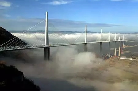 △ 法国南部的小湖山谷上空342米处,建有一座好似飞过谷底的大桥——米卢大桥。这座旷世大桥比埃菲尔铁塔还要高,花费了3年时间修建,于2004年正式通车。站在桥上俯瞰河谷别有一番情趣,当有雾气在桥下山谷萦绕时,会让你感到一阵炫目。桥的平均高度有245米,拥有世界上最长的单桥跨度(即相邻支撑架之间的距离)341米。(新华网)