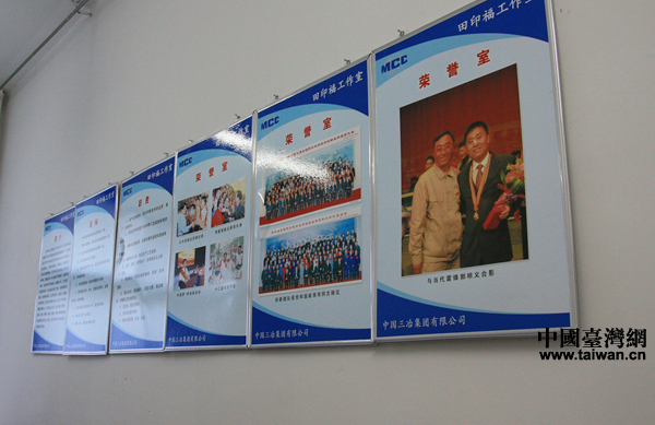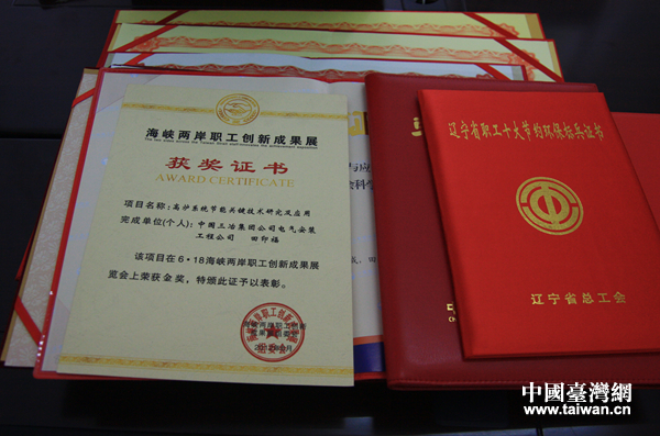 田印福曾获得“全国职工技术创新奖”、“海峡两岸创新成果展金奖”、“辽宁省十大创新成果奖”、“鞍山市科技进步奖”等奖项40余项,荣获“辽宁省节约环保标兵”、“辽宁省劳动模范”、“辽宁好人”、“全国劳动模范”等诸多称号,成为享受国务院特殊津贴的专家。图为田印福展示的部分荣誉。(中国台湾网 李帅 摄)