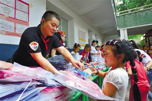 社会志愿者向学生赠送学习用品 摄/陈星宇