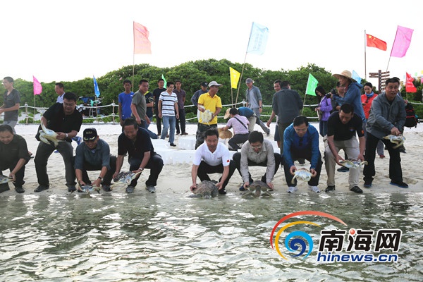 三沙市委书记、市长肖杰(中一)一行放生海龟。南海网记者高鹏摄