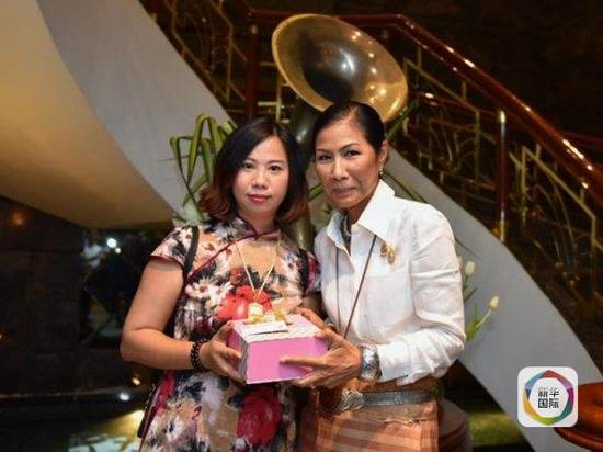 泰国旅游和体育部部长科甘(右)向为中国游客捐献“熊猫血”的南京导游杨莉赠送纪念品。(新华社记者李芒茫摄)