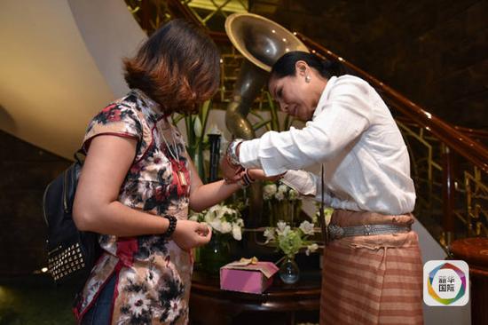 科甘(右)为杨莉佩戴象征泰国国旗三色的手链。(新华社记者李芒茫摄)