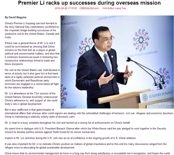 李总理在联合国总部的访问行程是多边外交。特别是在联大的发言具有特别重要的意义,李总理重申了中国在全球治理方面的立场和措施,从难民危机到倡议全球可持续发展方面都彰显了中国的声音和大国使命。他强调中国积极拥护并坚决支持联合国在国际社会发展问题上所发挥的作用,强调中国在保持国内相对稳定发展的情况下,世界上一些国家和地区还正在被恐怖主义,内战,难民问题和经济下行等潜在挑战所困扰。