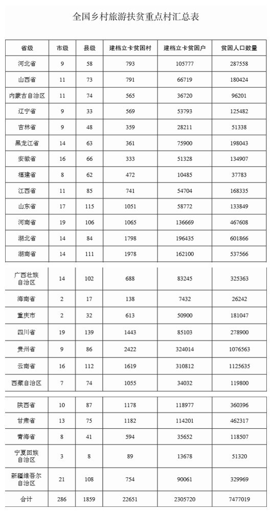 国家旅游局、国家发展改革委、国土资源部、环境保护部、住房城乡建设部、交通运输部、水利部、农业部、国家林业局、国务院扶贫办、国家开发银行、中国农业发展银行近日共同制定了《乡村旅游扶贫工程行动方案》,力争未来五年,通过发展乡村旅游,带动全国25个省(区、市)2.26万个建档立卡贫困村、230万贫困户、747万贫困人口实现脱贫。